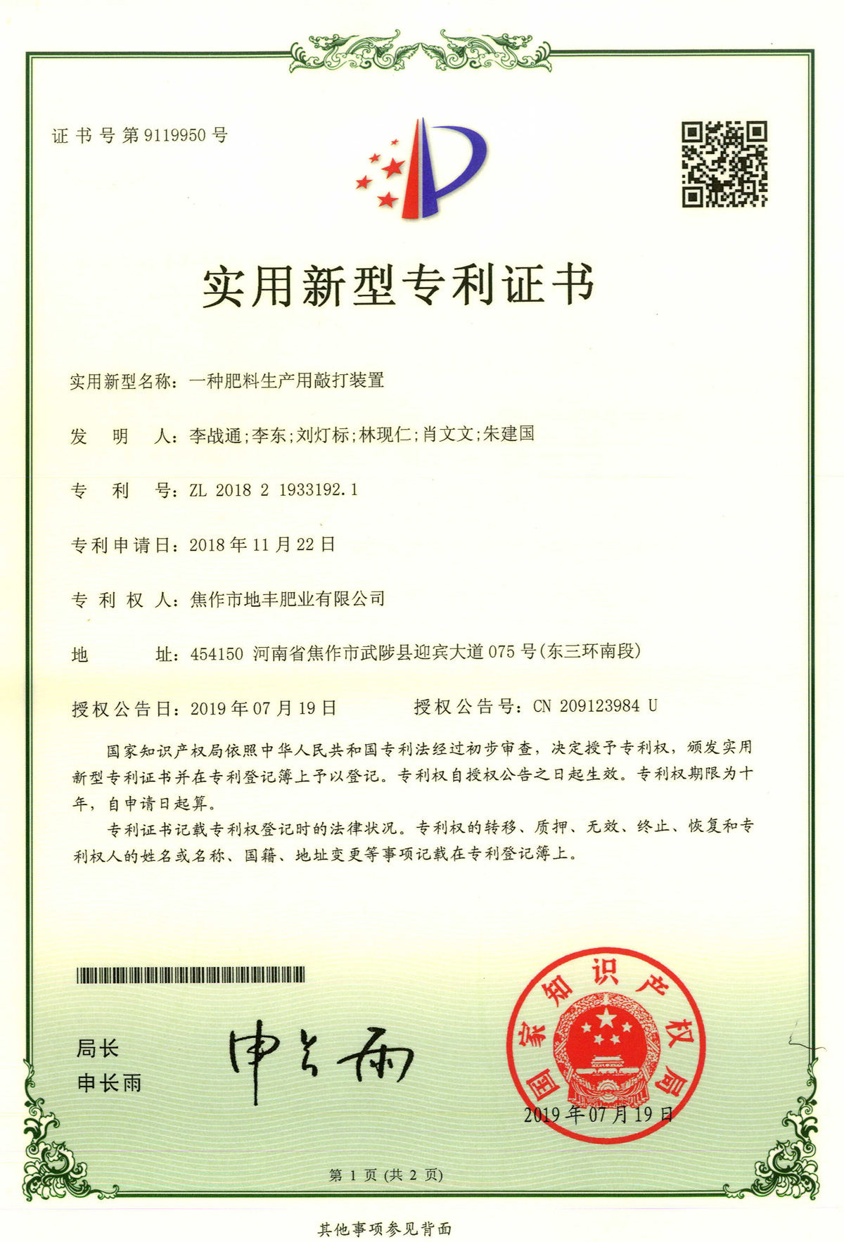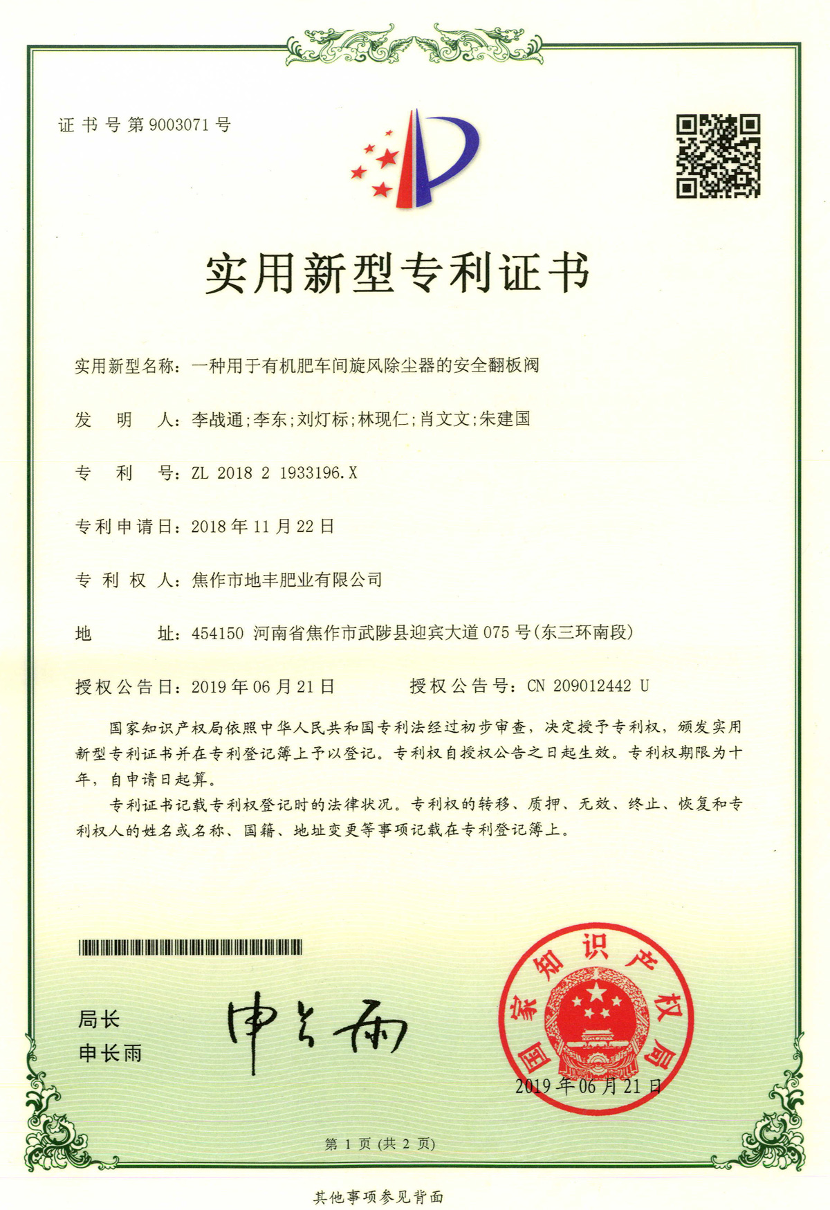 腐殖酸發(fā)明專利證書