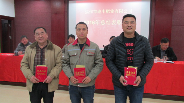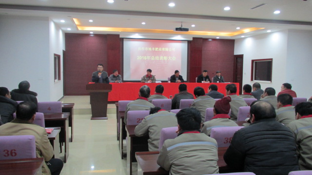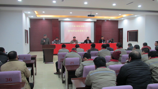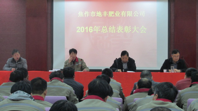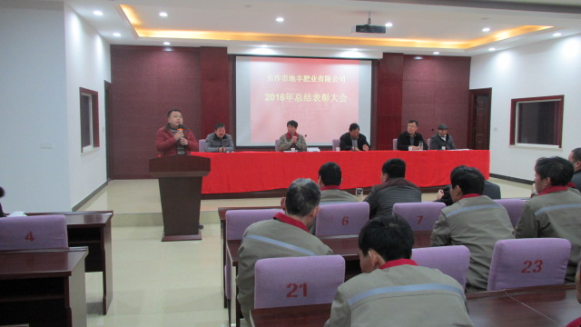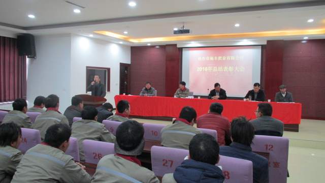 1月22日,焦作市地豐肥業(yè)有限公司2016年度總結(jié)表彰大會在三樓多功能廳隆重舉行。公司董事長李戰(zhàn)通,生產(chǎn)副總褚萬里、銷售副總林現(xiàn)仁等領(lǐng)導(dǎo)出席會議。